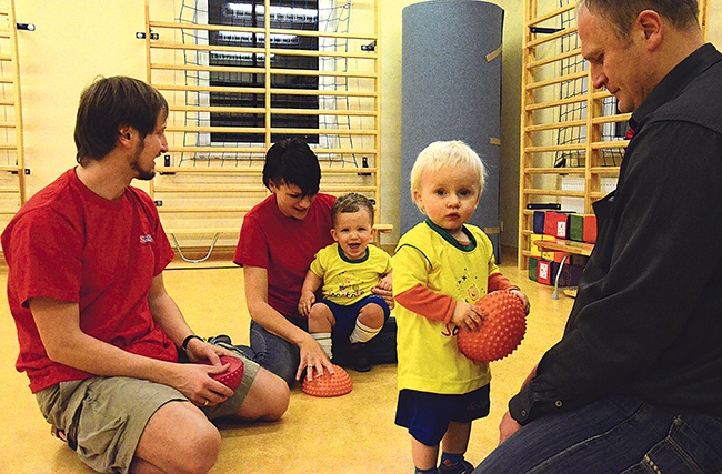 Trudno się dziwić, że dzieciom bardzo się podoba. Wielka sala gimnastyczna, piłki te prawdziwe i miękkie z materiału, i takie z gumy z kolcami jak jeże, i tor przeszkód, i wiele innych atrakcji, w których razem z dzieckiem szaleje rodzic – to niespotykane na co dzień w domu zjawisko. – Chodzi o to, by przez zabawę, w której dzieci czują się bezpiecznie, uczyć się pewnych rzeczy – mówią trenerzy. Maluchy głównie się bawią, ale przy wykorzystaniu określonych komend. Gdy od pierwszych miesięcy życia ktoś powtarza dziecku: teraz kopiemy piłkę prawą nóżką, w lewą rączkę bierzemy obręcz i wyglądamy przez nią jak przez okienko, naturalne staje się rozróżnianie strony prawej i lewej. – Wiadomo, że musi w tym pomagać mama lub tato. Dziecko nie rozumie wydanego polecenia, ale jeśli rodzic pokazuje, która to jest prawa nóżka, a która lewa rączka, i robi to systematycznie przez wiele zajęć, maluch odruchowo później reaguje na takie komendy – obserwuje Jan Staniewicz. Rozumienie poleceń i ich wykonywanie przenosi się z sali gimnastycznej na inne dziedziny życia.