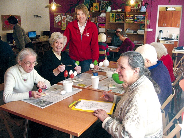 ŚDS powstał cztery lata temu, gdy ks. Krzysztof Strzelczyk, ówczesny proboszcz prokocimskiej parafii, zaproponował Caritas prowadzenie istniejącej tu od wielu lat świetlicy środowiskowej. Ks. Bogdan Kordula, szef krakowskiej Caritas, oraz dyrekcja Miejskiego Ośrodka Pomocy Społecznej stwierdzili jednak, że przy świetlicy miejsca wystarczy także dla osób chorych, które w tej części Krakowa nie mogły liczyć na zbyt wielkie wsparcie. Wybór padł na chorych na alzheimera. Od samego początku w ŚDS działają cztery pracownie: plastyczno-techniczna, kulturalno-muzyczna, gospodarstwa domowego i ruchowa. Bo choć naukowcy wciąż nie wynaleźli sposobu na całkowite pokonanie choroby, to dzięki odpowiednio dobranym lekom i ćwiczeniom można spowolnić jej objawy i zmobilizować układ nerwowy (zwłaszcza miejsca niedotknięte jeszcze chorobowymi zmianami) do aktywności, która dodatkowo sprawia radość i przyjemność. W pracowniach chorzy utrwalają bowiem znane od dzieciństwa czynności, które powoli zaczynały sprawiać im problem (samoobsługa czy przygotowanie posiłku), malują i rysują (i w ten sposób bez słów, których czasem nie pamiętają, mówią o swoich przeżyciach) albo robią piękne, świąteczne ozdoby. W planie dnia są też prasówka, czyli przegląd aktualnych wydarzeń, oraz gimnastyka i spacer, który nie tylko dotlenia mózg, ale jest też ćwiczeniem pamięci i orientacji w przestrzeni.