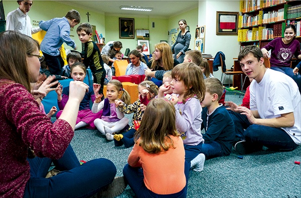 Przedpołudnie, druga niedziela miesiąca. Spory kościół MB Królowej Aniołów na Bemowie pęka w szwach. Dzieci wbiegają na schody prezbiterium, uśmiechając się z daleka do rodziców. Po Eucharystii kilkadziesiąt par z pociechami trafia do domu parafialnego. Młodsze dzieci pod bacznym okiem kilku opiekunów będą kolorować, śpiewać i brykać po kolorowych materacach, pięciolatki i starsze pójdą do oratorium na klubik biblijny z siostrą Patrycją.
