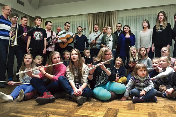 Trwają ostatnie próby instrumentów. Brzdąkają gitary klasyczne i akustyczne, a Filip Krypiak (chrześniak Piotra Krześniaka) podgrywa na basie. Filip, najstarszy z dziewiątki dzieci państwa Krypiaków, podaje też minigitarkę trzyletniemu bratu, Stasiowi. A niech dzieciak muzyką przesiąknie... Obok dziewczęta dostrajają flety poprzeczne. Mały Karolek Ostrowski szykuje trąbkę, a Tomasz Krypiak, ojciec dziewięciorga dzieci, rozgrzewa palce do skrzypiec. Wiadomo – przykład dzieciom w kolędowaniu dać musi! I daje: kilkuletnia córka Tereska taszczy ze sobą wielki bęben. I jeszcze puzoniści: schowani za filarem, czynią ostatnie próby.