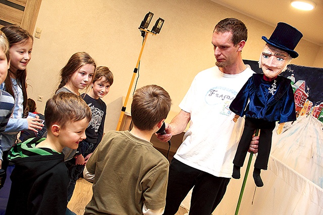 W „Opowieści wigilijnej” ważną rolę odgrywają postaci zmarłych, którzy zza grobu przekonują głównego bohatera Scrooge’a, by przestał być dusigroszem i przeżył Boże Narodzenie w zgodzie z innymi. Aktorzy wykorzystali trudny wątek duchów, by oswoić dzieci ze strachem – po spektaklu każdy widz mógł podejść do mikrofonu i mówiąc coś do niego, usłyszeć swój zmieniony głos, przypominający pojękiwania ducha. Dzieci śmiały się z tego do rozpuku, niektóre wręcz tarzały na materacach. Opowieść łagodzą też bajkoptaki, komentujące klasyczną, bądź co bądź nieco mroczną „Kolędę prozą”, jak głosił oryginalny tytuł dzieła Dickensa. Aktorzy Frajdy nie zamykają się na nowoczesne formy. – Być może kiedyś zagramy coś współczesnego, może nawet naszego autorstwa, ale na razie wystarczy nam klasyka. Wystawiamy 10 różnych spektakli, dzieci bardzo dobrze je przyjmują, to się po prostu sprawdza – mówi pan Maciej, zdradzając, że w zanadrzu trzyma plany wystawienia „Alibaby i 40 rozbójników”, ale musi jeszcze do tego przekonać żonę. – Dzisiaj pracujemy charytatywnie, miałem taką potrzebę serca – mówi Maciej Szreder. – Udało się nam znaleźć wolny termin, no i nie musieliśmy daleko jechać, bo jesteśmy z tej parafii. Chciałem, żebyśmy przed świętami zrobili coś bezinteresownie: dali dzieciom uśmiech, wprowadzili widzów w piękny świąteczny klimat.