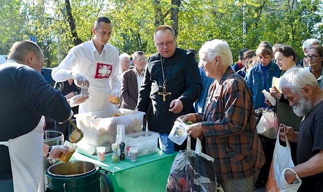 Inspiracją do pójścia krok dalej była wolontariuszka. – Przyszła kobieta, która powiedziała, że będzie dla nas gotować zupę dla bezdomnych. Robiła to u siebie w bloku na trzecim piętrze. W dzień pracowała, a w nocy gotowała 50 litrów zupy i nie chciała za to żadnych pieniędzy. Nawet składniki na zupę sama kupowała! – opowiada brat i dodaje: – Trzeba było jednak wymyślić coś innego, bo ta pani miała swoje lata i była schorowana. To było już dla niej bardzo męczące. Tym bardziej że ludzi zaczęło przybywać, bo ta zupa była naprawdę smaczna, z mięsem i ziemniakami. Obecnie posiłki są przygotowywane w klasztorze Misjonarzy Oblatów Maryi Niepokalanej w Obuchowie koło Kijowa. Za każdym razem jest to przynajmniej 150 litrów zupy, 25 litrów kompotu, 50 bochenków chleba.