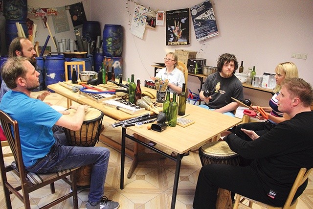 Na próbach spotykają się dwa razy w tygodniu. Każde spotkanie trwa 2,5 godziny. − Tworzymy nowe utwory, dzielimy się na sekcje i każda ćwiczy swoją część. Potem zgrywamy to w całość. Mamy też próby, na których skupiamy się na rozwoju umiejętności uczestników, wykonujemy ćwiczenia, wspólnie improwizujemy – mówi J. Marciszewski. – Ja mam duży problem z rytmem. Kiedyś tak się zagapiłem, że wszedłem ze swoją partią o kilka minut za późno. Ale koledzy mnie pilnują. Sebastian kiedyś oblał mnie wodą, żebym się skupił. „Już dawno grasz!” – huknął na mnie − śmieje się Janek. – Zespół to zespół. Czyli, że każdy może zabrać głos. Jeśli mamy jakiś pomysł, to przedstawiamy go panu Jarkowi, a potem o nim rozmawiamy – dodaje Jacek.