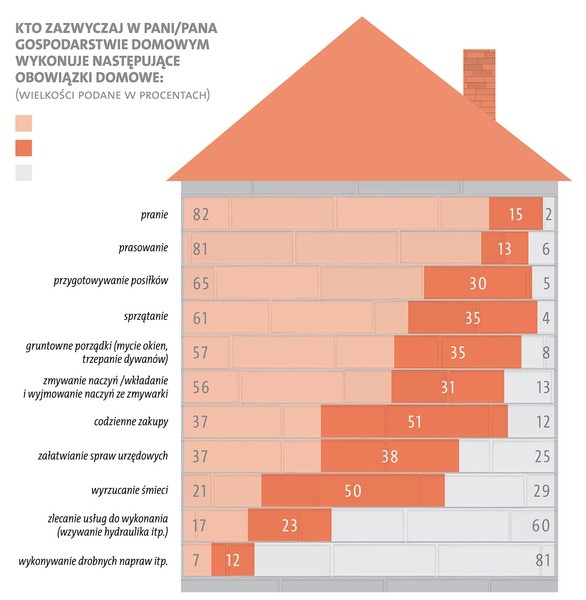 Z danych wynika, że zmywanie naczyń, a coraz powszechniej ładowanie i opróżnianie zmywarki, to praca coraz częściej wykonywana przez mężczyzn. Tę czynność panowie wykonują chętniej w stosunku do badań z 2013 r. (wzrost o 5 punktów procentowych). Podobnie wygląda to w kwestii drobnych napraw domowych. Choć aż 90 proc. badanych mężczyzn wskazywało te czynności jako obowiązek wykonywany głównie przez nich, kobiety zgadzają się z tym w 75 proc. Częściej niż mężczyźni wskazują one na wspólne lub samodzielne, w zależności od ilości wolnego czasu, naprawianie drobnych usterek w domu. Natomiast pranie i prasowanie to wciąż zajęcia należące prawie wyłącznie do kobiety (82 proc. i 81 proc.).