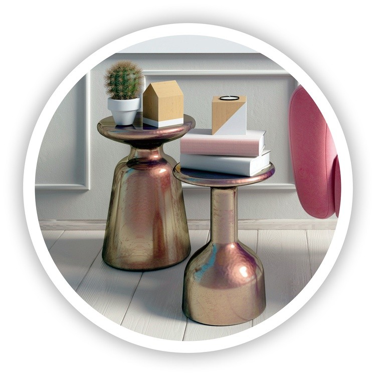 Stoliki kawowe w kolorze miedzi i złota to bardzo modny element